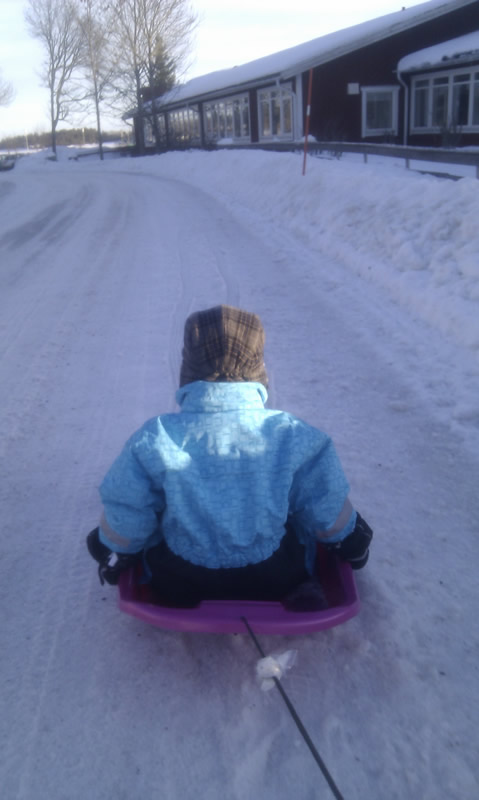 Lilla S. och jag tog en promenad till skolan och åkte lite pulka, halkade omkring på den spolade isen och klättrade uppför snöhögar.