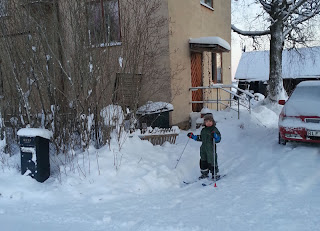 Det märks att lilla S. är van vid långa, aktiva dagisdagar. Han blir rätt vild hemma. Kvart i tre lyckades jag äntligen locka ut honom. Snowracer i kyrkbacken ville han dock inte åka, nej det skulle vara skidor...